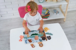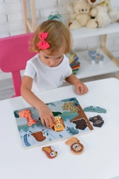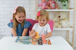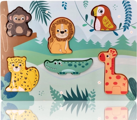 Lesena 3D sestavljanka Safari živali je idealna igrača za otroke od 12 mesecev naprej. Pomaga razvijati kognitivne spretnosti tako, da otroci vstavljajo različne oblike živali v ustrezne izreze.