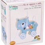 Lesena igrača na kolesih z medvedkom privlači pozornost in spodbuja otroka k gibanju.