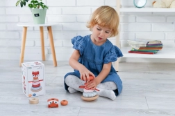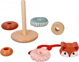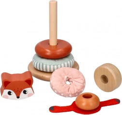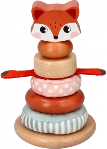 Stolp za zlaganje z motivom lisice je idealna igrača za majhne otroke, ki želijo raziskovati svoje čute. Vsak del igrače ponuja različne teksture, od gladkega lesa do mehkih tkanin in je namenjen razvoju senzorične integracije. Žive barve in vzorci pomagajo pri razvijanju vizualne percepcije, medtem ko zlaganje in manipuliranje posameznih delov krepi fino in grobo motoriko.