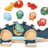 Lesena otroška sestavljanka v obliki dinozavra z barvnimi oštevilčenimi koščki je idealna za razvoj motorike in računskih veščin otrok od 12 mesecev dalje.