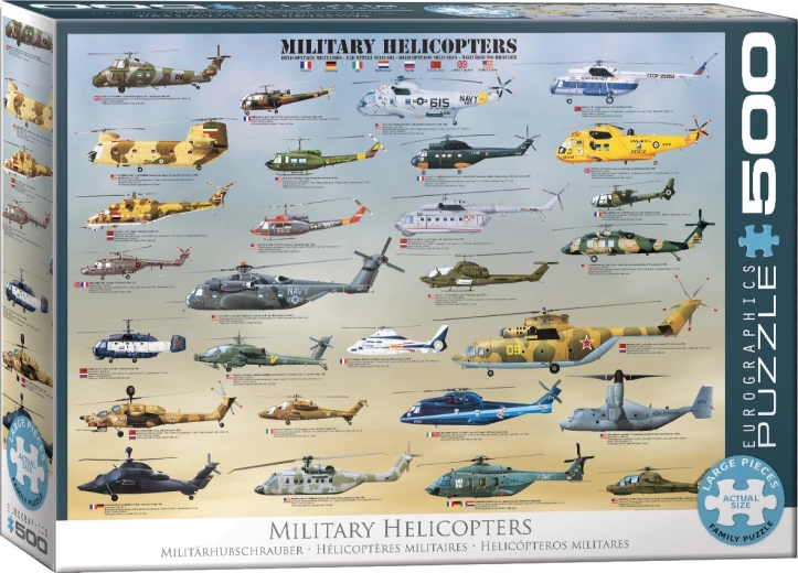 Ta sestavljanka bo zagotovo razveselila vsakega letalskega navdušenca! Prikazanih je več kot 25 najpopularnejših vojaških helikopterjev v zgodovini, vključno z Eurocopter Tiger, Comanche in Chinook.