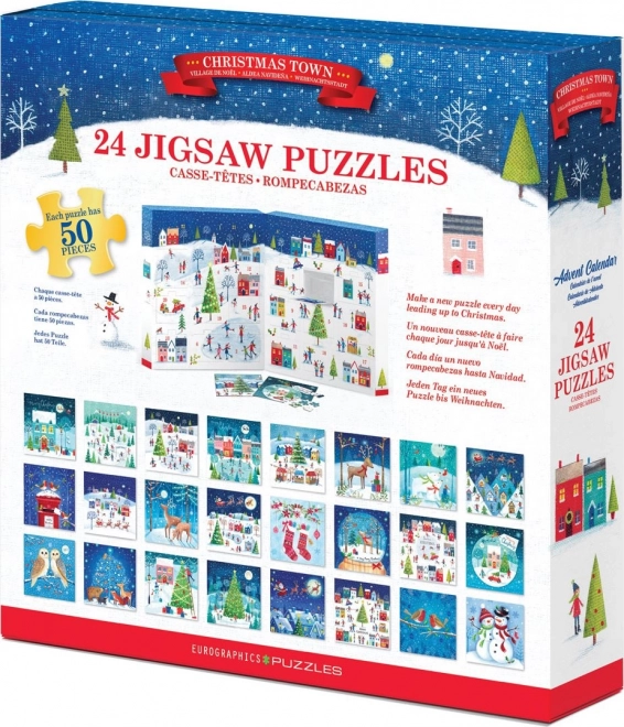 Adventni koledar EUROGRAPHICS prinaša vsak dan novo mini sestavljanko z božičnimi motivi. V pakiranju je 24 samostojnih sestavljank, vsaka s 50 koščki, ki se po sestavi spremenijo v kvadratne slike velikosti 12,5 × 12,5 cm. V vsakem okencu je natisnjena tudi predloga, zato je sestavljanje prijetno tako za otroke kot odrasle.