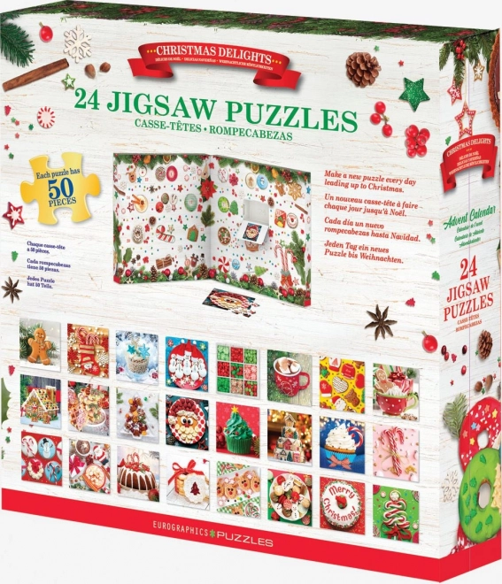Ta adventni koledar EUROGRAPHICS prinaša veselje v vsak decembrski dan. V 24 okencih najdete 24 različnih sestavljank, vsako s 50 koščki in čudovitim božičnim motivom. Slike so kvadratne in po sestavljanju merijo približno 12,5 × 12,5 cm. V vsakem okencu je priložena tudi predloga za lažje sestavljanje, na zadnji strani embalaže pa najdete pregled vseh motivov.