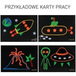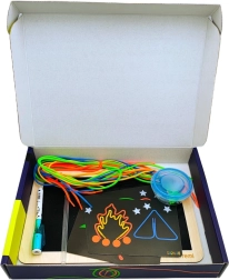 - Popolna oprema v paketu – LED svetilka s fluorescenčnim flomastrom, 16 barvnih vrvic različnih dolžin, tabla z ježkom, držalo–pero, barvne filcaste oblike s škatlico ter 4 delovne kartice (8 motivov).