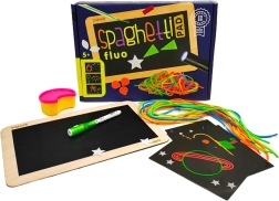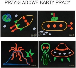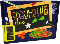 Set Spaghetti Fluo prinaša čarobno igro svetlobe in barv. Prožne vrvice preprosto pritrdite na tablo z ježkom in v hipu ustvarite izvirne motive ali pa kopirate predloge z delovnih kartic. Po osvetlitvi z LED svetilko s fluorescenčnim flomastrom motivi oživijo z izrazitim žarečim učinkom – idealno za ustvarjanje, učenje in sprostitev.