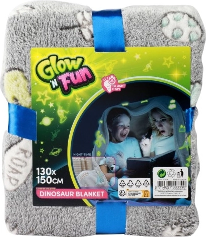 Mehka in topla odeja z vzorcem dinozavrov, ki v temi resnično svetijo. Dovolj je kratko osvetljevanje in uživali boste v čarobnem nočnem učinku, prijetnem plišastem materialu ter praktični dimenziji 130 × 150 cm za počitek doma ali na poti.