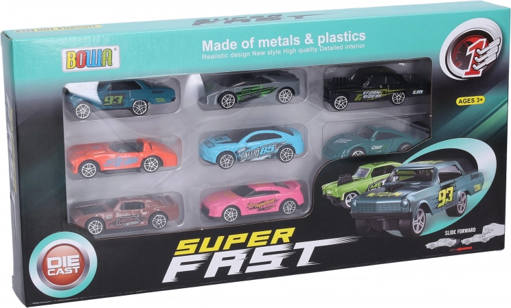 Set vsebuje 8 kovinskih avtomobilčkov z prostimi kolesi velikosti 7,5 cm, idealno za zbiratelje in otroke.