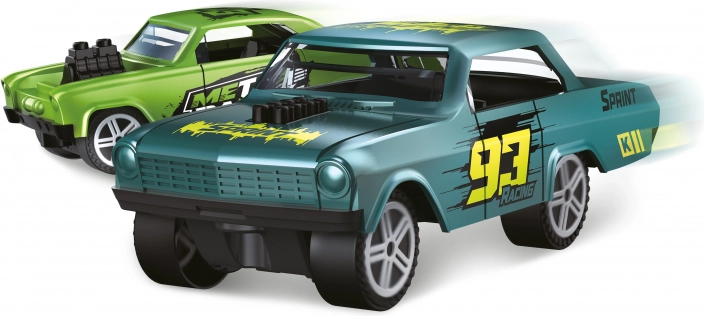 Vsak avtomobilček je dolg 7,5 cm in zahvaljujoč prostim kolesom zlahka vozi po vsaki površini. Idealno za scenarije mestnih dirk ali mirne vožnje na preprogi.