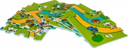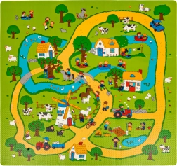Odkrijte zabavno penasto podlogo z motivom življenje na podeželju, ki ustvarja varen in spodbuden prostor za vaše otroke. Iz nje sestavite kvadratno igralno površino s potmi, jezercami, drevesi, stavbami, vetrnico, živalmi, vozili in liki – popolno kuliso za igro s figuricami.