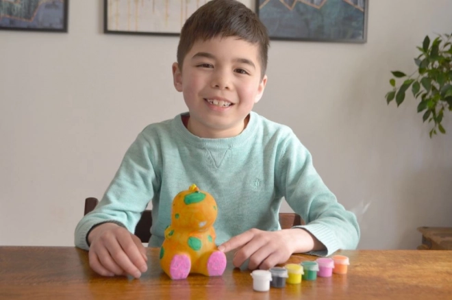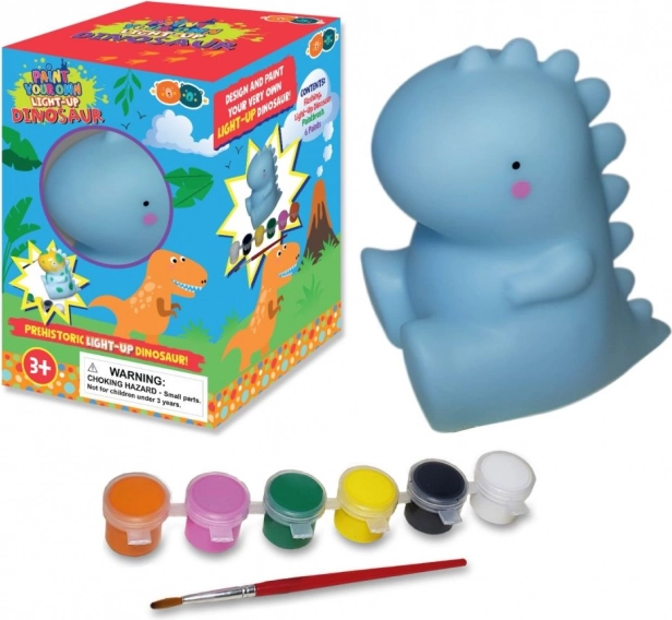 Odkrijte zabaven ustvarjalni komplet, s katerim si otroci pobarvajo svojega dinozavra in ga spremenijo v svetlečo dekoracijo za sobico. Model višine 14 cm se dobro prilega tudi majhnim rokam in bo po barvanju polepšal poličko ali nočno omarico.