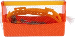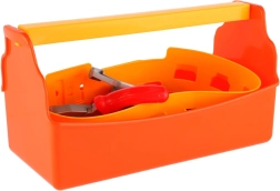 Oranžen plastičen zaboj z močnim rumenim ročajem in notranjim predalčkom ohranja vsa orodja pregledno na enem mestu, otroci pa ga zlahka odnesejo s seboj.