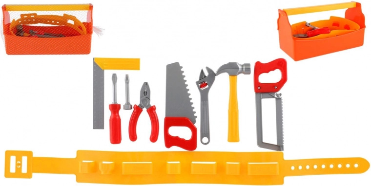 - Plastičen zaboj, pas za orodje, izbor otroških orodij (npr. kladivo, ključ, klešče, izvijač, žagica)
