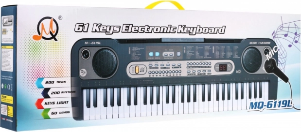 Otroški keyboard s 61 osvetljenimi tipkami, 200 ritmov, 200 tonov in 60 demo skladb. Učni način, mikrofon in stojalo za note. Napajanje z adapterjem ali 6× AA.