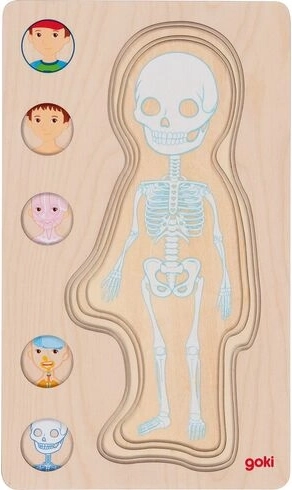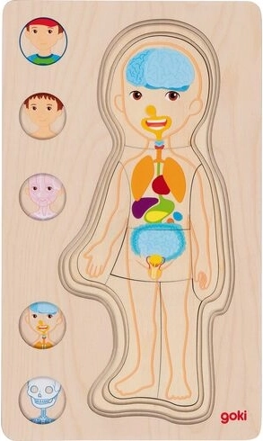 Odkrijte, kako deluje človeško telo na igriv način! Te lesene večplastne sestavljanke znamke GOKI prikazujejo dečka v petih nivojih – od kože, preko mišic in organov, do okostja. Otroci ob sestavljanju urijo fino motoriko, razvijajo logično razmišljanje ter pridobivajo osnovna znanja anatomije na zabaven in nazoren način.