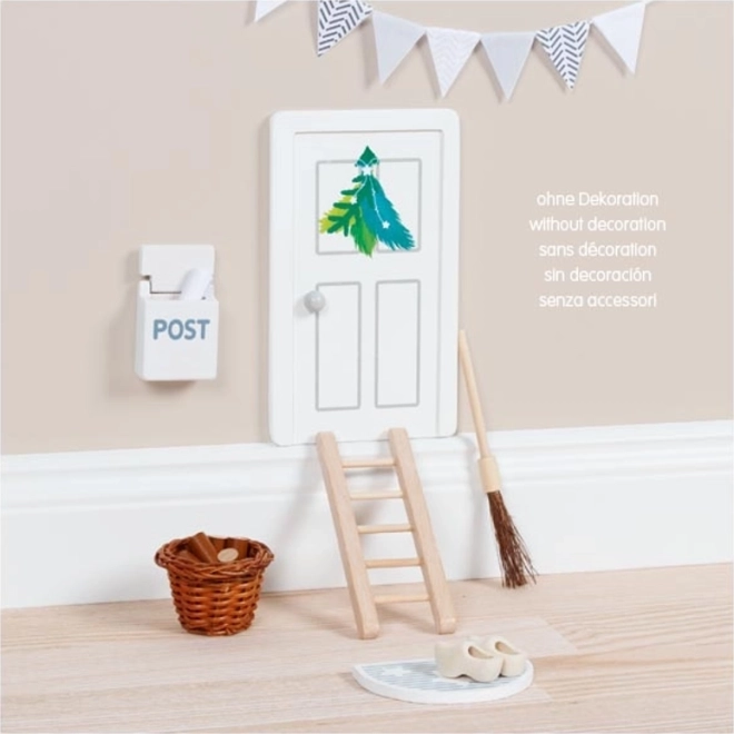 Čarobna lesena škratja vratca GOKI s poštnim nabiralnikom. Preprosta namestitev, 5-delni set, mere 9,4 × 16 cm. Idealno za adventne tradicije.