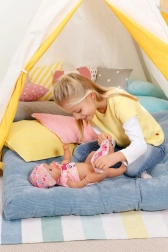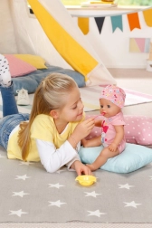Punčka BABY born punčka z magičnim dudkom je idealna spremljevalka za vsakodnevno igro in učenje skrbi za dojenčka. Z obračanjem dudka odpre ali zapre oči, in to tudi sede – ne glede na položaj telesa. Ko jo položite na hrbet brez dudka, se oči samodejno zaprejo. Mehko telo Soft Touch ter lahko gibljive roke, noge in glava olajšajo preoblačenje in povečajo pristnost.