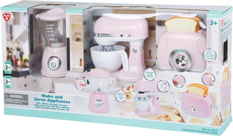 Odkrijte zabaven rožnat komplet Playgo za male kuharje: opekač kruha, mešalnik in ročni mešalnik. Naprave delujejo kot prave, imajo svetlobne in zvočne učinke ter spodbujajo kreativno igro in razvoj spretnosti. Idealno za otroško kuhinjico za otroke od 3 let.