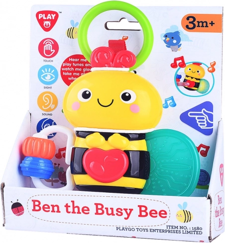 Prisrčna čebelica Playgo razveseli najmlajše z svetlobnimi in zvočnimi učinki, ki se aktivirajo s pritiskom na srček na trebuščku. Ponuja tudi grizalo in dva obročka na gibljivem škripajočem krilu za razvoj čutov in fine motorike.