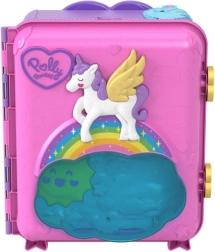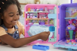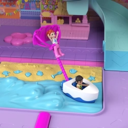 Ta barvit kovček POLLY POCKET Pollyville Resort Roll Away se v hipu odpre v tri nadstropja, polna zabave: hotelski preddverje z dvigalom, soba z kadjo, slasten bife, arkadne igralnice in zunanja čas z plažo. Premični elementi in aktivacije prek zavorne grbine oživijo atrakcije – čakajo vas parasailing, let s helikopterjem, spiralni tobogan in vrtiljak.