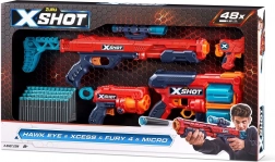 Komplet X-Shot Combo prinaša štiri različne blasterje za vsak igralni slog: precizni Hawk Eye z merkom, zmogljivi Xcess z dvojnim rotacijskim bobnom, hitri Fury 4 in žepni Micro za neopazne akcije. V paketu najdete 48 penastih puščic, zato vam v vročini igre ne bo zmanjkalo municije.