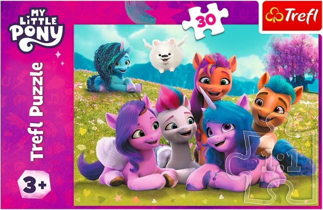 Sestavljanka Prijazni poniji z motivom iz priljubljene serije My Little Pony ponuja 30 kosov za vse male oboževalce. Končna slika meri 270 × 200 mm.