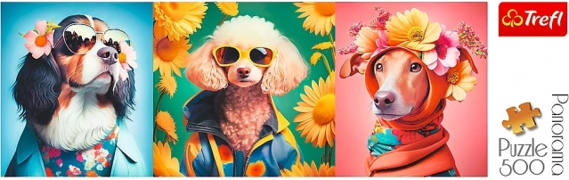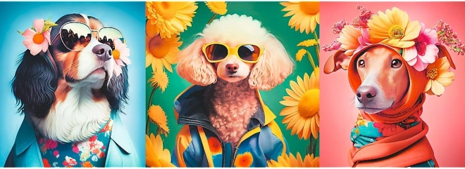 Odkrijte igrivi svet pasje modne revije v živahnih barvah in impresivnem panoramskem formatu. Stilsko oblečeni kužki s sončnimi očali in cvetjem spremenijo sestavljanje v zabavno doživetje, končna slika pa postane izvirna dekoracija.