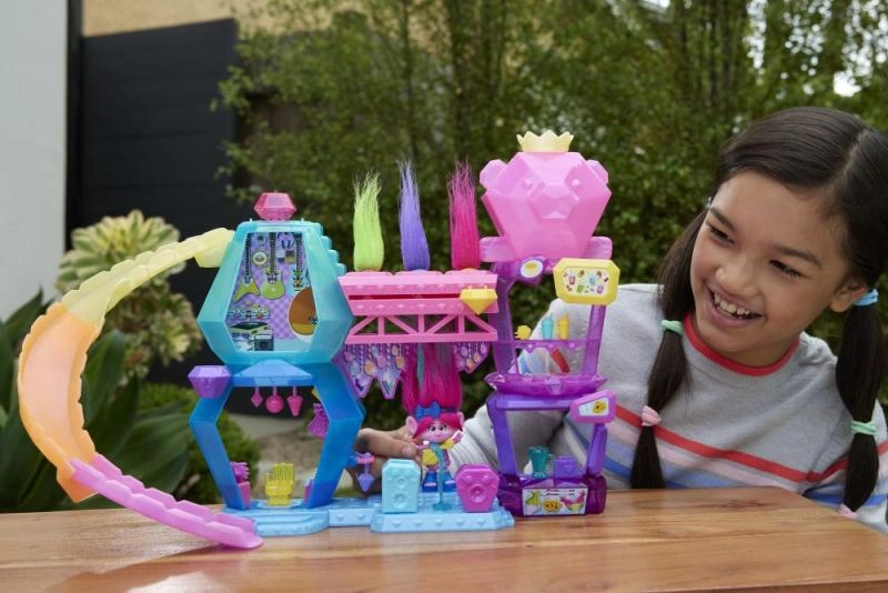 Vstopite v svet Trolli Mount Rageous s prikupno punčko Poppy, štirimi Hair Pops in več kot 25 dodatki za neskončne zgodbe. Dvonadstropni igralni set s toboganom, barskim kotičkom, garderobo in odrom ponuja obilico interaktivne zabave, vključno z izstreljevalnikom Hair Pops – potisnite dragulj in opazujte, kako Hair Pops poletijo! Odlično za ustvarjalno igro otrok od 3 let dalje.