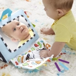 - Senzorična igra na vseh straneh: veliko ogledalce za raziskovanje obraznih izrazov, šumeča plošča, mehke viseče oznake in kontrastni vzorci