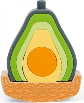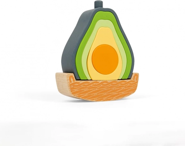 Igralni set v obliki avokada združuje les s silikonom za stik z živili za varno in zabavno učenje. Otroci lahko dele zlagajo, razvrščajo in pustijo, da se avokado ziblje na leseni osnovi. Pet silikonskih delov je mehkih, trpežnih in odlično služijo kot senzorična igrača. Materiali so netoksični, silikon je mogoče pomivati v pomivalnem stroju, leseni deli pa imajo certifikat FSC.