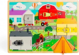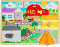 Ta barvita motorična deska otrokom nudi varen prostor za vajo vsakdanjih spretnosti – od zapiranja zadrge, prek zaponk, do odklepanja različnih ključavnic. Realistični elementi otroke učijo samostojnosti ter spodbujajo razvoj fine motorike in potrpežljivosti.