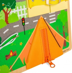 Raznoliki mehanizmi – od zadrge do zapahov – otroke učijo praktičnih veščin in krepijo fino motoriko na naraven, igriv način.