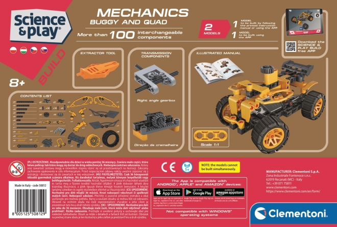 Ta znanstveni in kreativni gradbeni komplet prinaša več kot 100 kakovostnih komponent za sestavljanje dveh funkcionalnih modelov – buggyja in štirikolesnika (ni ju mogoče sestavljati hkrati). Deli so zasnovani za trdno in natančno spajanje, zato je konstrukcija stabilna in vzdržljiva tudi pri igri na terenu.