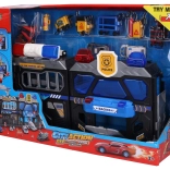 Zabavna in praktična igrača za male policijske junake: prenosna policijska postaja z merami 56 × 18 × 23 cm ponuja svetlobne in zvočne učinke, aktivacijo z gumbom na modri plošči ter bogato opremo. Priložena sta 2 avtomobila s prostotekočimi kolesi, prometni znaki, gasilski aparat, avtopralnica, bencinska črpalka, diagnostika in drugo. Baterije 3× AG13 so priložene.
