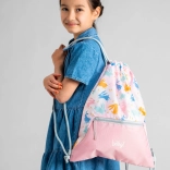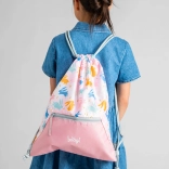 V spodnjem delu je praktičen žepek na zadrgo, v katerega varno spravite drobnarije, ključe ali robčke. Močne vrvice omogočajo hitro zapiranje in hkrati udobno nošenje na hrbtu kot nahrbtnik. Karabin ob strani olajša pripenjanje na šolsko torbo ali nahrbtnik, da je vrečka vedno pri roki.