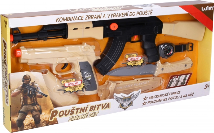 Otroški akcijski komplet za male vojake vsebuje puškomitraljez 52 cm, pištolo s tokovom 20 cm, nož s tokovom 25 cm in uro. Orožja ob pritisku na sprožilec oddajajo realistične akustične zvoke brez potrebe po baterijah, puškomitraljez pa se preprosto polni z ročico na levi strani. Odličen komplet za tematske igre vojakov s češko embalažo.