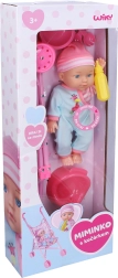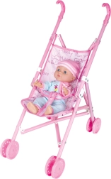 Ljubek dojenček z zvočnimi učinki in zložljivim vozičkom bo razveselil vsakega malega skrbnika. Priložena je bogata oprema za igro – mini voziček, posodica z jedilnim priborom, kahlica in steklenička. Ob pritisku na trebušček se oglasijo zvočni učinki. Baterije 3× AG13 so priložene v pakiranju.