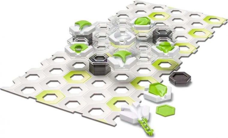- Vsebina pakiranja: 2 osnovni plošči, 1 prozorna ravnina, 8 velikih višinskih elementov, 4 mali višinski elementi, 2 kretnici, 1 element 3‑v‑1, 1 vrtinec, 1 ciljni lestev, 4 osnovni elementi, nastavki: 2 lovilca, 1 prosti pad, 1 razdelilnik na tri, 1 cilj, navodila.
