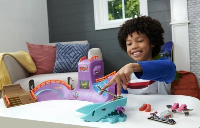 - Vsebuje rampe, tirnice in stopnice, pa tudi morskega psa, ki se aktivira ob dotiku s skateboardom!