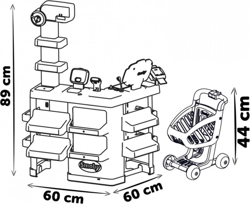Supermarket z blagajno, oddelkom za sadje/zelenjavo in tehtnico (nova mehanska tehtnica: prikazana teža se prilagaja glede na tehtana živila). Otrok lahko nastavlja uro in tablo odprto/zaprto. Vsebuje 42 dodatkov: testenine, piškote, kosmiče, mleko, 6 kosov sadja in zelenjave, 1 pito, 2 makrona, 2 pločevinki, 1 elektronski čitalnik črtnih kod z zvokom in svetlobo, 1 kreditno kartico, 4 račune, 9 kovancev in 12 bankovcev. Blagajna ima predal za denar, mikrofon in čitalnik kreditnih kartic. Voziček je priložen.