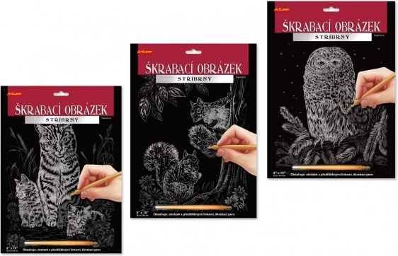 Črno premazan papir skriva sijočo srebrno podlago, zaradi katere se vsaka postrgana linija spremeni v izrazit detajl. Predtiskane konture zlahka poudarite s priloženim peresom – brez zadržkov pa dodajte tudi lastne vzorce ali okvir, domišljiji ni meja.