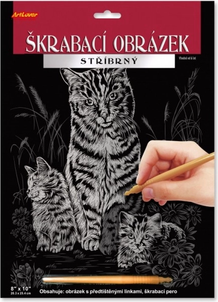 Odkrijte praskanko ARTLOVER z motivom mačke z mladiči, ki po odstranitvi premaza razkrije srebrni učinek. Dimenzija 20 × 25 cm, v paketu plastično praskalno pero (14 cm). Odlična kreativna zabava od 6. leta naprej ter razvoj fine motorike.