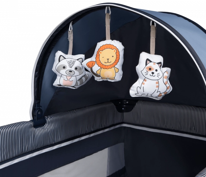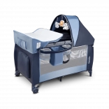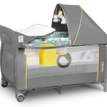 Bogata oprema povečuje udobje otroka in staršev: priložena mreža proti insektom varuje med spanjem, previjalna mizica in stranski panel s tremi žepi pa ohranjata potrebščine pri roki. Interaktivni elementi, kot sta melodije in prisrčen kužek, zabavajo dojenčka, ročaji pomagajo pri učenju vstajanja. Kakovostna mehka podlaga je odporna proti obrabi in enostavna za vzdrževanje.