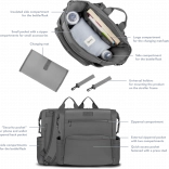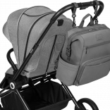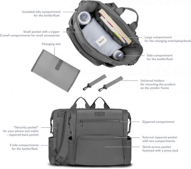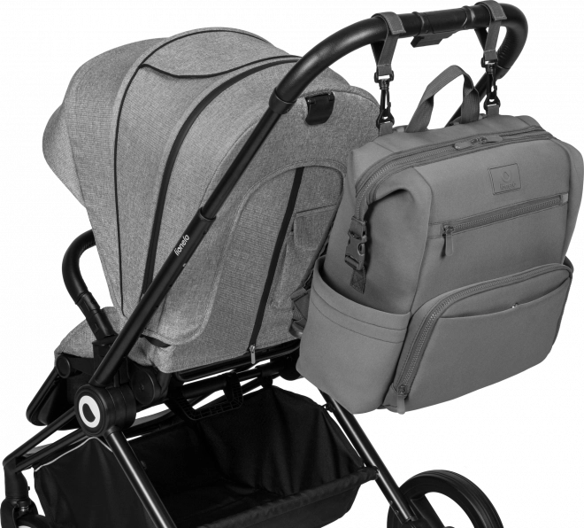 Premišljena razporeditev omogoča hiter dostop do vseh nujnih stvari za dojenčka in starše. Univerzalne zaponke omogočajo enostavno pritrditev na voziček, pomožni trakovi pa prilagoditev velikosti tako, da se nahrbtnik prilega tudi pod sedež v letalu.