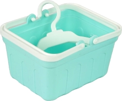 Praktičen koš z ročajem olajša prenašanje perila, dva obešalnika pa pomagata ohranjati red – idealen dodatek za realistično igro.