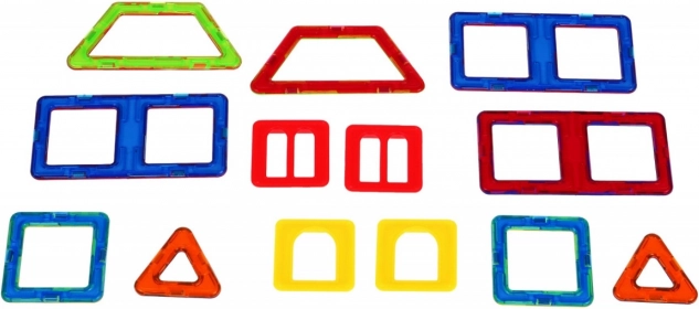 - Vsebina kompleta: 9 magnetnih delov (3× pravokotnik, 2× trikotnik, 2× trapez, 2× kvadrat) + 4 plastična polnila (kvadrati z izrezi), vzorčnik modelov in barvita darilna embalaža.