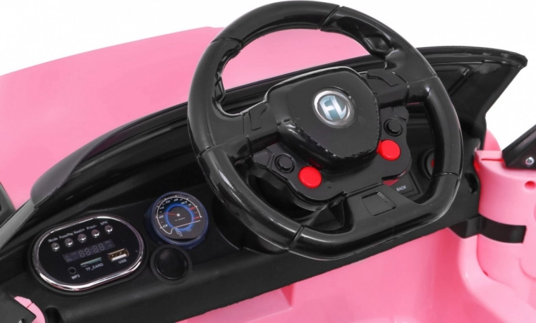 Starši bodo cenili daljinski upravljalnik 2,4 GHz s tremi hitrostmi in gumbom za varno zaustavitev STOP. Za udobje skrbijo štirje blažilniki (2× spredaj, 2× zadaj), varnostni pasovi in odpirajoča se vrata z blokado. Avdio panel omogoča predvajanje z USB, SD kartice, preko AUX in vgrajenih melodij, prisotna sta tudi hupa na volanu in prikaz stanja napolnjenosti.