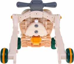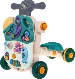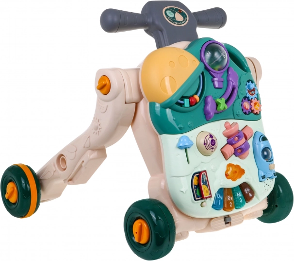 Multifunkcijska plošča ponuja svetlobne učinke (utripajoče lučke, osvetljene orglice) ter zvoke in melodije. Otroke navdušijo vrtljiva kolesca, drsniki, zobniki, snemljiva raketa z vrtečo se kroglico in mini piškotki, knjižica za listanje ter kroglični elementi. Zahvaljujoč nastavljivi višini, blokadi koles in nedrsečim pnevmatikam je igra varna v vsakem načinu.