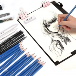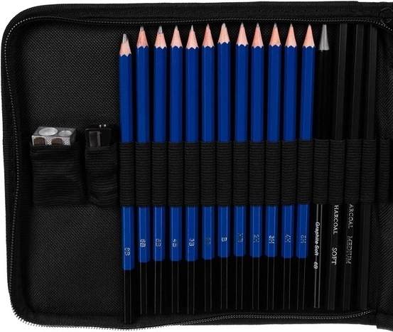 Ta univerzalni 32-delni risarski komplet združuje različne trdote svinčnikov (B, HB, H), oglje v lesu in v palčkah ter grafitne palčke, da dosežete fine linije, globoke sence in tekoče tonske prehode. Vse je pregledno shranjeno v vzdržljivem etuiju z zadrgo in paščkom, ki ščiti orodja in olajša prenašanje.