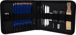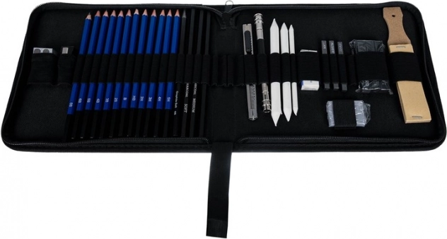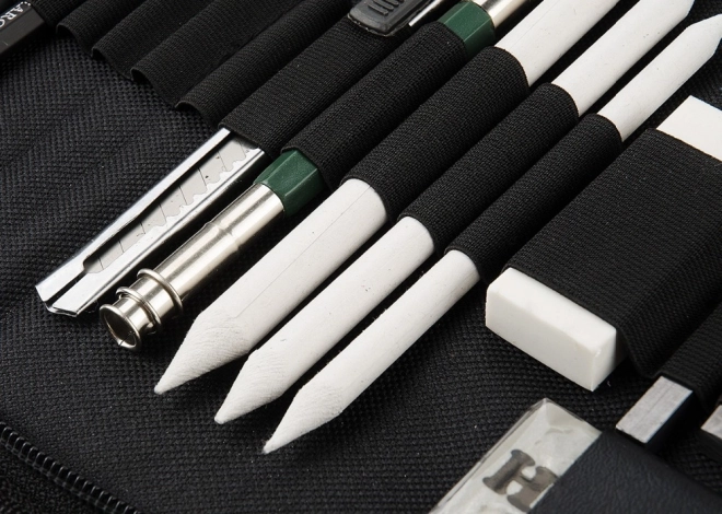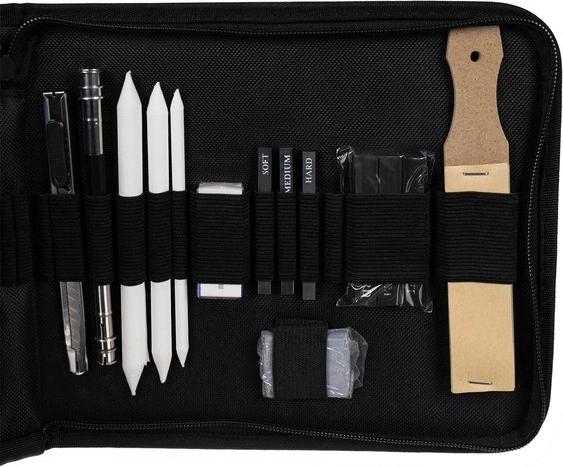 Sestavni del so tudi blendarji (papirnati tortiljoni) v treh premerih, knjigoveški nož, dvojni in klasični šilček, gnetljiva radirka ter klasična radirka in komplet brusnih papirjev za popolno oblikovanje konice. Komplet je odličen za portret, tehnično risbo in umetniške skice.