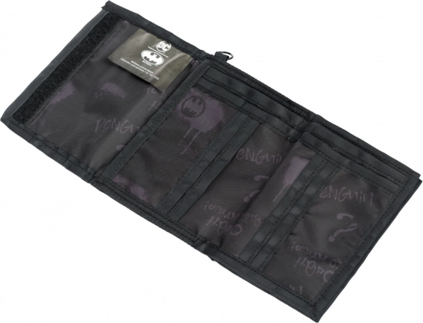 Ta edinstvena denarnica z uradno licenco DC Comics se ponaša z izrazitim dizajnom z motivom Batmana. Opremljena je z več predali za kartice in gotovino, kar zagotavlja odlično organizacijo vaših dragocenosti. Praktično zapiranje na ježka in zanka za pritrditev na karabin prispevata k njeni funkcionalnosti in varnosti.